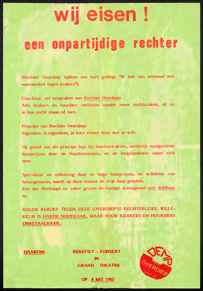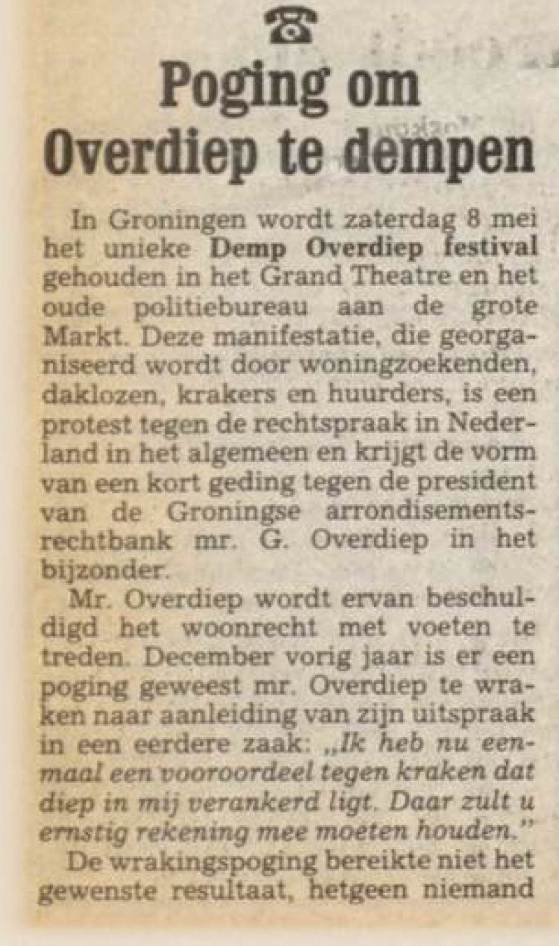 Het is 1981 en middenin de woningcrisis als in de stad Groningen op meerdere plaatsen de leus ‘demp Overdiep’ verschijnt. De leus is een van de vele uitingen van maatschappelijke kritiek die door middel van graffiti worden geuit. ‘’Demp Overdiep’’ was een slimme woordspeling. De stad Groningen kent immers meerdere gedempte diepen (wateren) in de stad. Daarbij was de boodschap duidelijk: dr. Overdiep moest zijn mond houden. Aldus de activisten. Maar wat was de achtergrond van deze onrust?