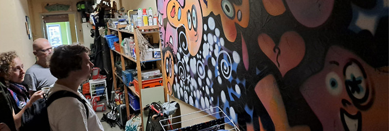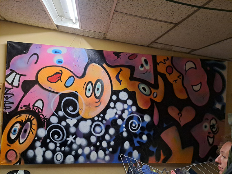 Linwood “Quik” Felton had found his way to Groningen from Amsterdam. Museum and gallery appearances made way to a longer stay in Europe, that was kept going by working at Grand Theatre and Martien’s workshop. Quik’s background is in hiphop and New York and Martien’s background was in punk and new wave in Groningen. That fit together. “There wasn’t a lot of money going on in those days so you had to, you know, find other ways. Printing is also expensive, but you have to do that. And Grand theatre had a way of financing that. (…) I more or less work for free and Quik worked more or less for free. Thats how it was done in the 80s and 90s”. Quik and Martien shared a friendship. When asked about the painting on the RKZ corridor, more precisely on Martien’s residences front door, he resumes; “Quik was used to getting people to do things for him, and he did things for them.” The door mural was painted with acceptance from the community of RKZ. An Afro American New Yorker painting in the white RKZ community was unusual. The thematic of the mural reflected from Martien’s character and desire. Ice cubes and fire combines to a paradox. Martien’s art and print practice praises the impossible combinations. A doll character in the painting is of Quik’s signature practice. The letters MRTN is an pseudonym of Martien. The long lasting graffiti painting of fire and ice is a token of intercontinental recognition.