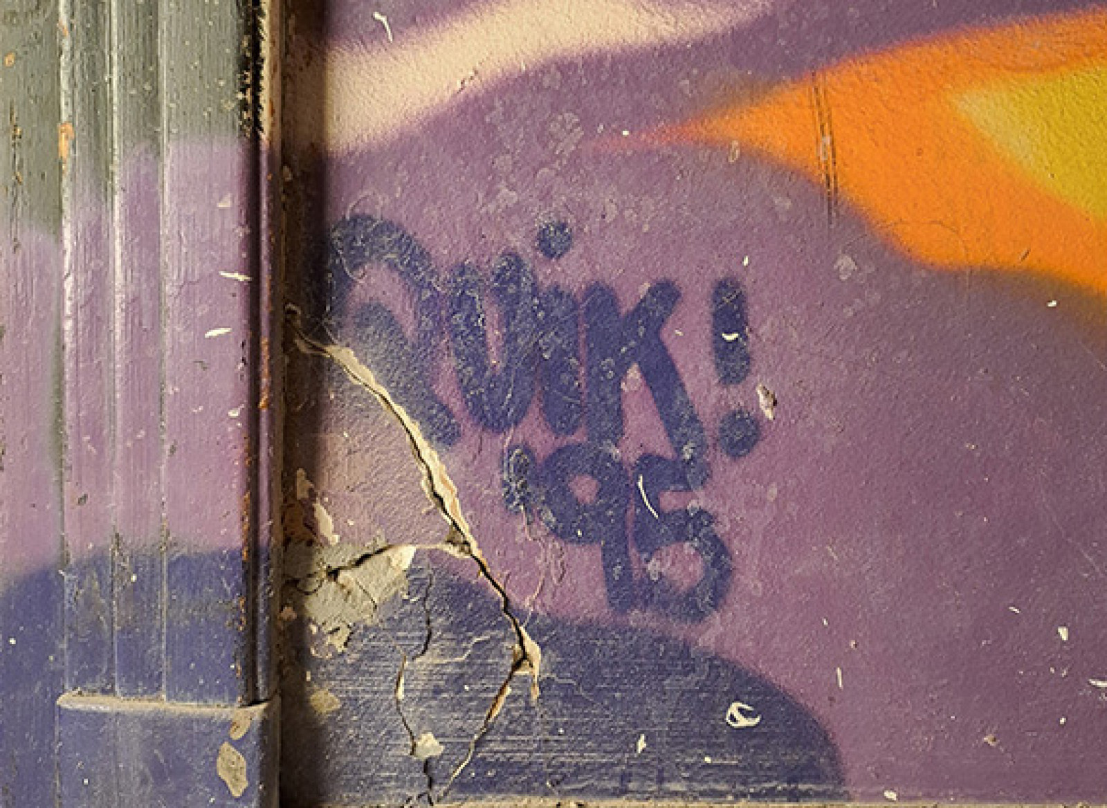 Its 2022 and I roam the corridors of the notorious RKZ with my friend. RKZ is his home, an auto organised living quarter, an old hospital complex in the Helpman area that was squatted in 1979. Its hallways are filled with paintings and art pieces along with the residents belongings. A calm hospital aesthetic blends with punk. Lists of tags can be found in toilets, on doors, hatches and walls. RKZ is a time capsule and a guestbook for street anthropologists. As we walk along I notice a painting that sticks out of the general diversity of murals and scribblings. There stands a piece by Quik, a spray paint avantguardista from New York that spent time in Groningen in the 1990’s. The painting is dated 1995 and reads MRTN. The transience of a graffiti painting is written on its DNA; a painted wall calls for being painted over again. The fact that this painting stood here for 27 years makes an impact in itself. Only by resisting urban nature will a graffiti piece live a long life.