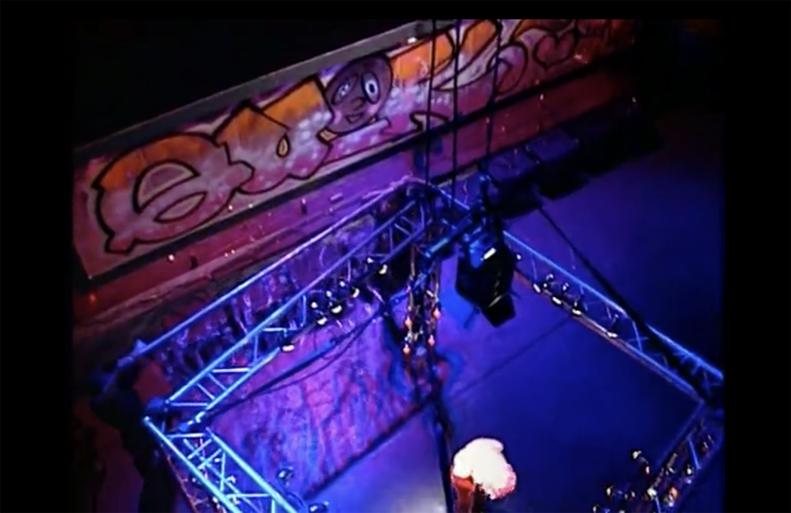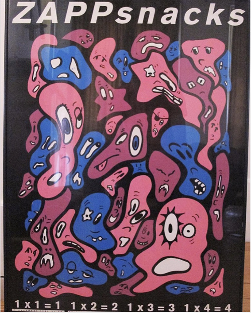 Spending time in Grand Theatre, Quik ended up working with a cutting edge new theatre performance chronicle, ZAPPsnacks, that was created and directed by Andre Pronk and Sjoerd Wagenaar. ZAPPsnacks is conceptual theatre that produces fast performances that aim in sensory overload. In a Volkskrant interview from 1994, Andre Pronk mentions his aim to produce a ZAP for your brain; too much information to be seen at once. Shows last from 7.5 minutes to 15 minutes and showcase combinations of different artistic fields through a number of performers, sceneries and lighting. Every ZAPPsnacks was played once. Martien printed the posters for the shows, as in that time he used to do for Grand theatre. A poster was designed by Quik. Quik performed in ZAPPsnacks 1x4=4 (the forth chapter of the first 4 shows) that was played in 1994. He performed along with Nasser Martin Gousset, MC Sherlock and DJ Lodewijk, with music by Zombi Squad. Later on a ZAPPsnacks performance took place in Groningen museum along with Quik’s artworks.