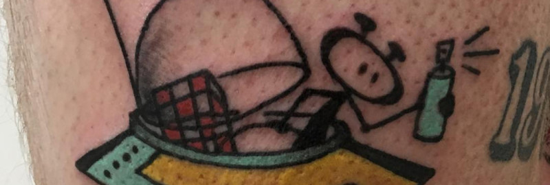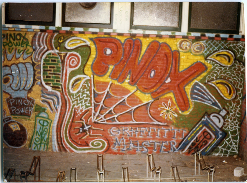 Pinox: “Bij de tattooshop waar ik vroeger rondhing heb ik toen wel wat plaatjes losgepeuterd. Daar had ik een kikker vandaan en een roze panter, een krekel met een spuitbus, dat soort shit. Mijn cartoons kwamen allemaal uit de tattoo wereld en daar ben ik later ook weer in terecht gekomen. Door tattoo invloeden te verwerken kon ik me onderscheiden van anderen. Dat deed niet iedereen. Ik heb eens een kikker gemaakt en daar heb ik weken aan gewerkt. Dan had ik weer een paar busjes verf en kwam er steeds een stukje bij. Tja, de glory days.
