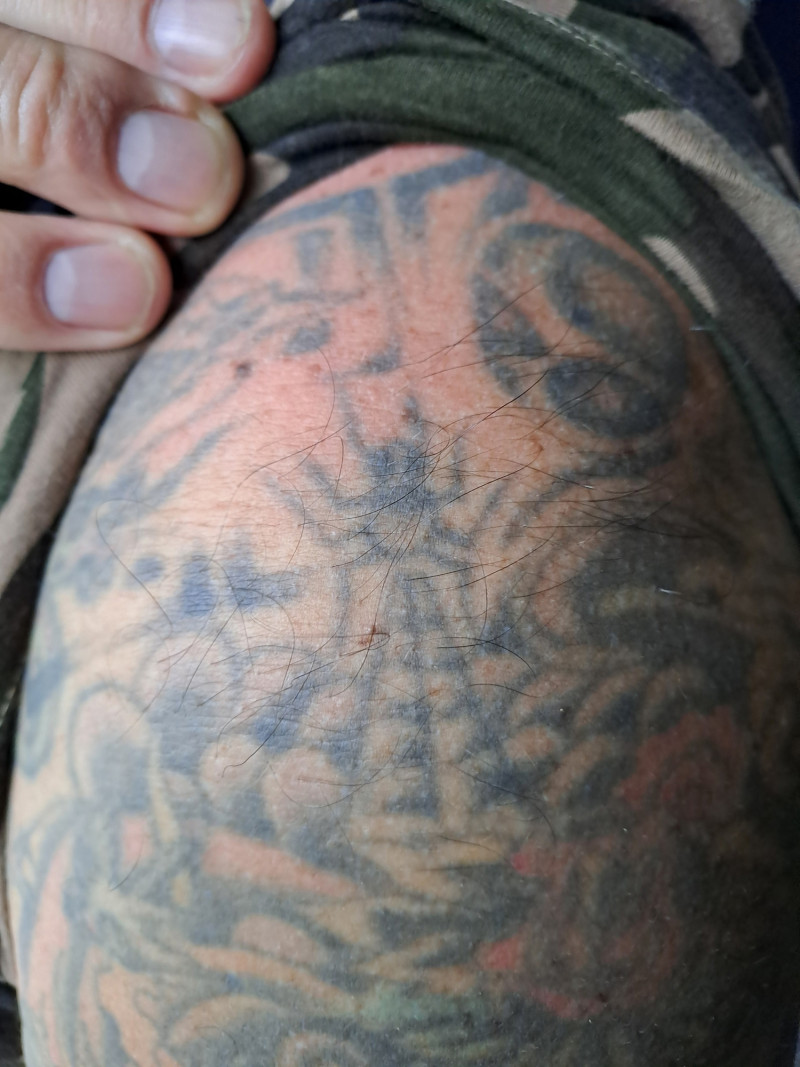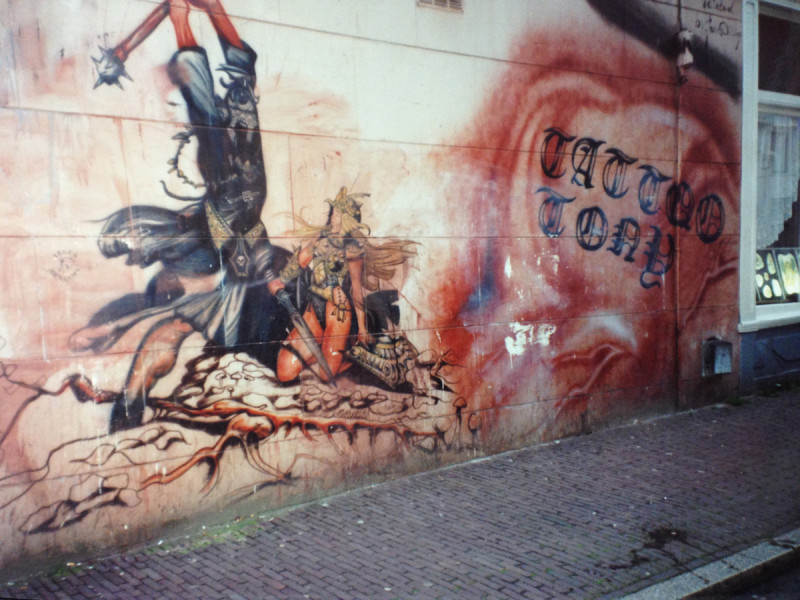 Graffiti en tattoeëren hebben overeenkomsten en graffiti heeft mij ook wel geholpen bij het leren tekenen. Alleen werk je in een andere volgorde. Het opbouwen van een tattoo is anders dan het opbouwen van een piece waar er als laatste de outline nog even omheen gaat en dat is bij een tattoo niet zo. Tattoeëren is echt schaken, acht stappen vooruit denken En dat is met graffiti ook, je moet heel goed weten wat je doet en in welke volgorde. Heel veel doe je op ervaring. Graffiti is natuurlijk illegaal dat geeft een andere druk. Dan is het bijvoorbeeld wel handig als je wat mensen in de beurt hebt die je op tijd een seintje geven. Op den duur begin je je materiaal beter te leren kennen. Je weet wat je ermee kunt en je ontwikkelt je creatieviteit, en de één was daar sterker in als de ander. Later heb ik het omgezet in tattooëren en toen is de graffiti voor mij afgezwakt.”
