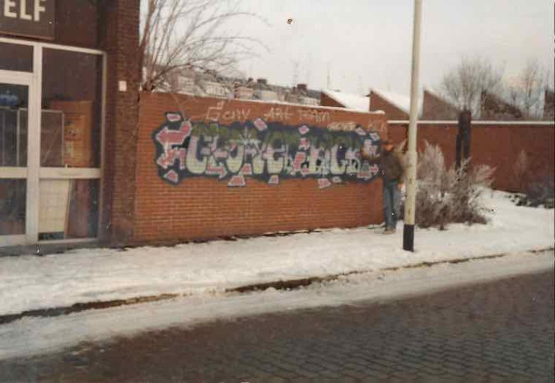 Grover (Erik Mertens) zette zijn eerste tags als FC Groningen supporter, samen met anderen: de Z-side tag. In het voetbalstadion liet hij ook een eigen vlag zien, zoals andere supporters. Zijn vlag toont de schuilnaam die hij koos: Grover. Deze foto is genomen vanaf een tv-scherm met de wedstrijd FC Groningen tegen Ajax in 1983. Zelf zat Grover natuurlijk achter zijn eigen vlag.