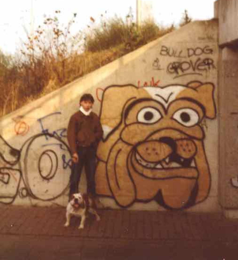Bij de fietstunnel van de Noorzeeweg, bij De Hoogte, maakte Grover een piece met zijn karakteristieke bulldog. Deze bulldog was ook echt zijn hond: die staat hier samen met de maker afgebeeld op de foto, De meeste writers hadden geen poedeltjes, maar ‘dog’-achtige, stoere honden. Opvallend groot ook de letters GO, Groningen Oost: de aanduiding van de crew en het gebied waar zij werkzaam waren.