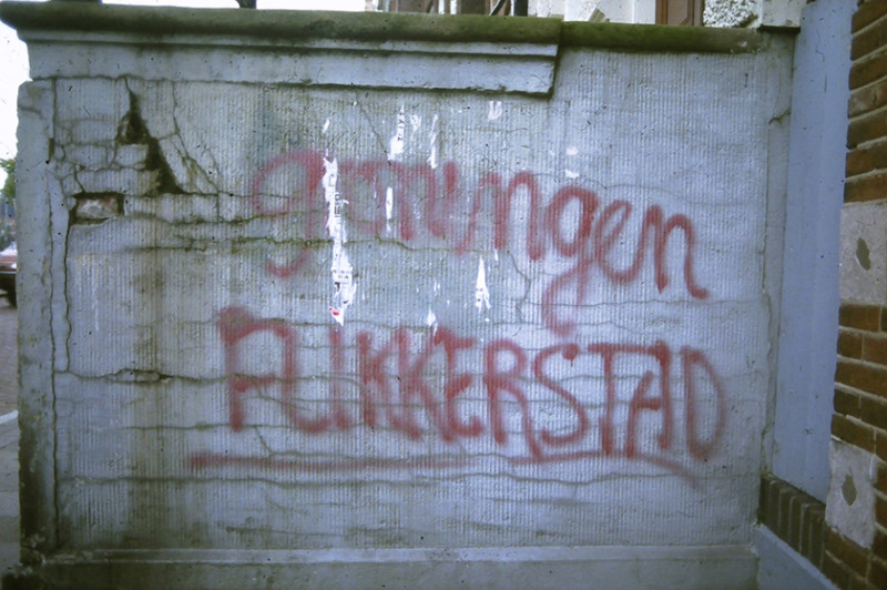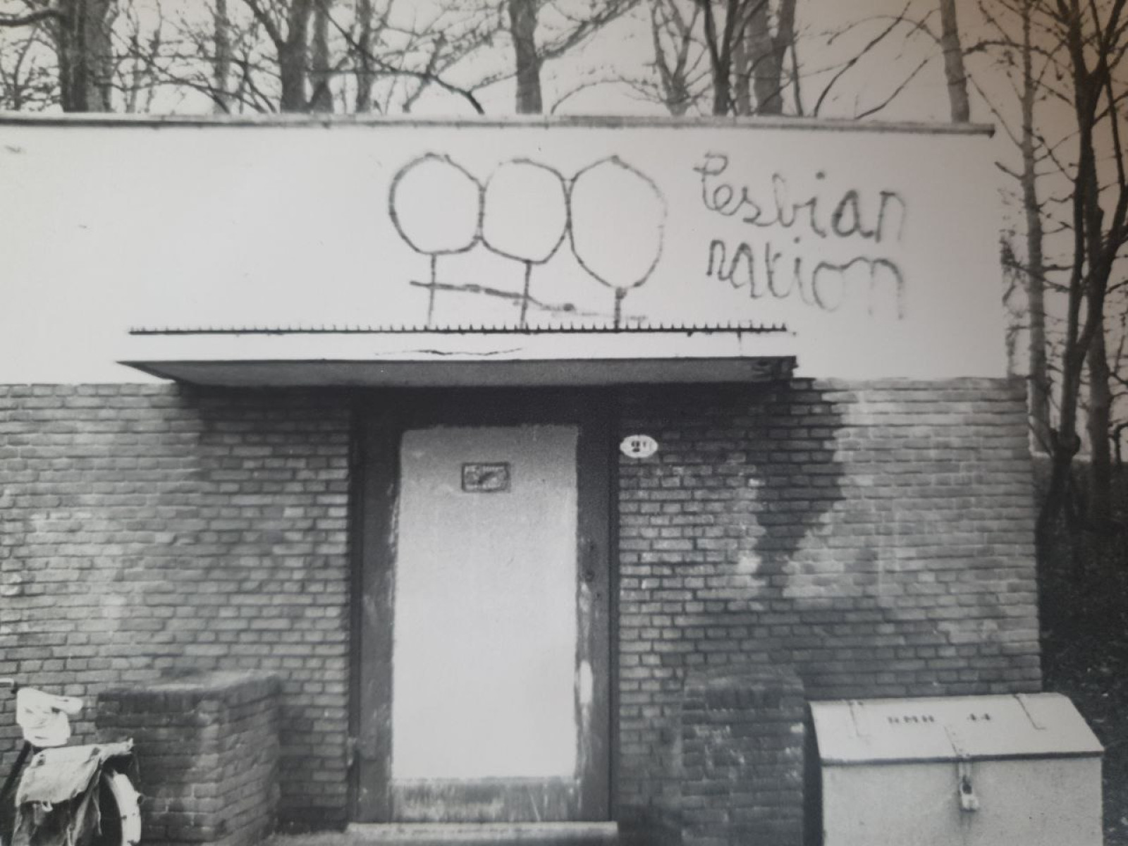 “Lekker lesbies lebberen” is nadrukkelijk niet van de hand van Margriet, dat wil ze volkomen duidelijk hebben. “Ik vind het een buitengewoon ordinaire manier van uiten”.(14) We begonnen het gesprek met Groningana Lesbiana, een bekende tekst van Margriet in de Kreupelstraat, en sluiten af met een stuk graffiti op het elektriciteitshuisje in het Noorderplantsoen, wat Margiet nog steeds trots “mijn huisje” noemt. Het was een lastige plek om te beklimmen. Ze schreef er de tekst “Lesbian Nation”, wat in die jaren door meerdere lesbische initiatieven werd gebruikt en wat kwam van het boek “Lesbian Nation. The Feminist Solution” van Jill Johnston. Na het zetten van die tekst, kreeg ze er eens een foto van, met op de achterkant de tekst: “Ga zo door! uw fans”.(15)