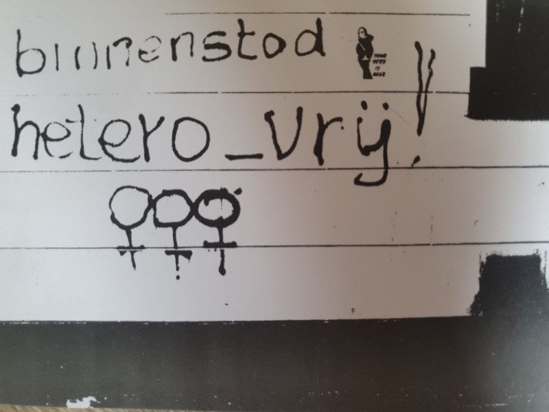 Wie het omvangrijke graffiti-archief van Kladmuur doorkijkt, en goed oplet, valt het misschien op: tussen de zich telkens herhalende tags vind je ook lesbische leuzen en symbolen. Wie waren deze vrouwen die kwast en spuitbus ter hand namen om het ‘potteuze bewustzijn’ te verspreiden? Eens zien of ik iemand kan vinden die ik erover kan spreken…