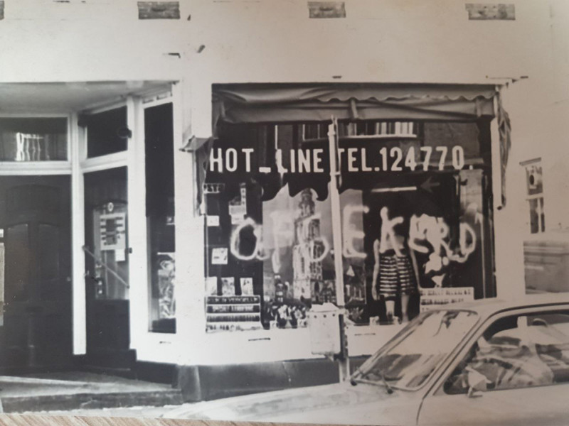 We praten verder over de verschillende lesbische leuzen die je zoal kon tegenkomen in Groningen. De tekst “Liever Lesbies” stond op vele plekken. Er was ook een reclametekst van slagers in die tijd “Vlees mevrouw, u weet wel waarom”, die werd aangepast tot “Lesbies mevrouw, u weet wel waarom”.(13)
