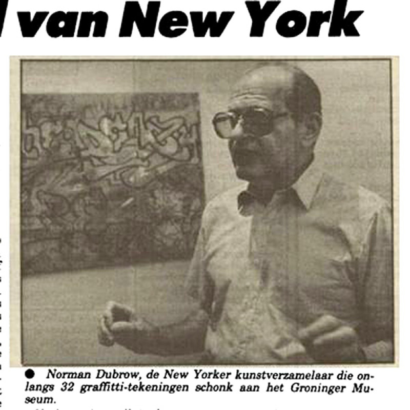 Begin februari 2024 overleed Norman Dubrow op 97-jarige leeftijd in New York. Omdat hij een belangrijk kunstverzamelaar was, werd daar in New York aandacht aan besteed. Maar wat heeft deze man met de graffiti in Groningen te maken? Heel veel en dat is een bijzonder verhaal. Dubrow was werkzaam bij de gemeente New York als ingenieur en leefde in een klein appartement. Hij had geen gezin en besteedde zijn gehele inkomen aan het kopen van werk van jonge kunstenaars in New York. Maar omdat hij geen ruimte had voor al die kunstwerken, liet hij ze opslaan in de galeries waar hij ze had aangeschaft óf, en zeker in het begin, schonk ze onmiddellijk aan musea. In New York ging dat soms nogal moeizaam, tot zijn frustratie. In het begin van de jaren tachtig kocht hij veel tekeningen van jonge graffitikunstenaars.