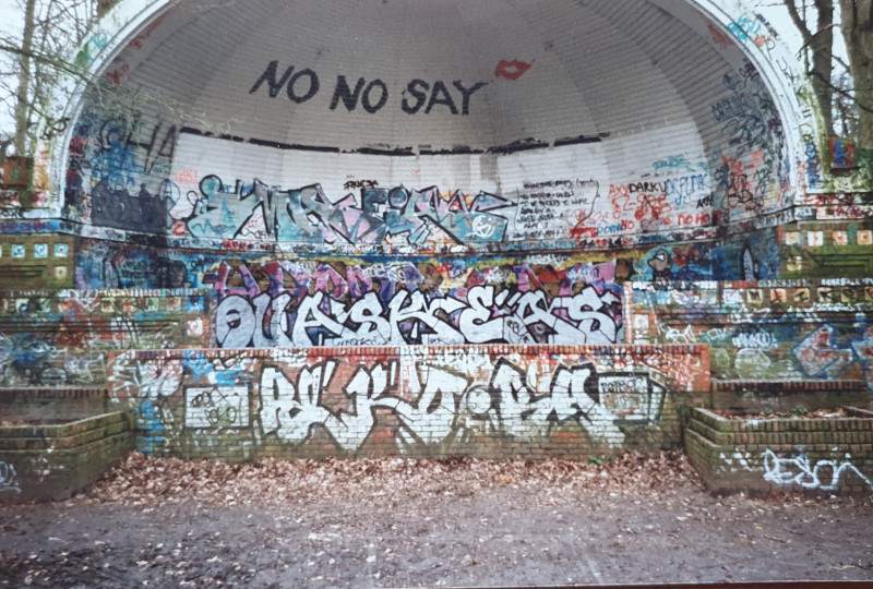 Daarnaast was er een andere route naar een andere bekende spot. Veel kleiner dan de ESA, maar niet minder fraai. Het was een kleine tien minuten lopen over de Hereweg naar het Sterrebos. Eenmaal onder het viaduct door, moest je vlak voor de Van Mesdagkliniek linksaf het bos in. Het had altijd iets van een spooky feeling. Maar als je dan eenmaal halverwege was in dat bos, zag je als allereerste vanuit het bos het voorste muurtje opdoemen. Snel checkten we of daar ook ruimte was voor ons om ons ding te doen. Ik vond dat voorste muurtje persoonlijk ook toffer dan die ronde muur in de Koepel, ook omdat het altijd enorm stonk naar pis, bier en zwervers.