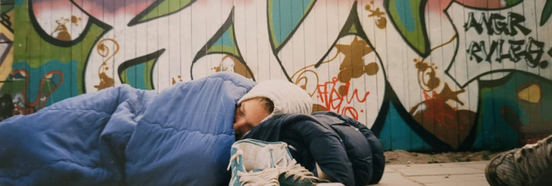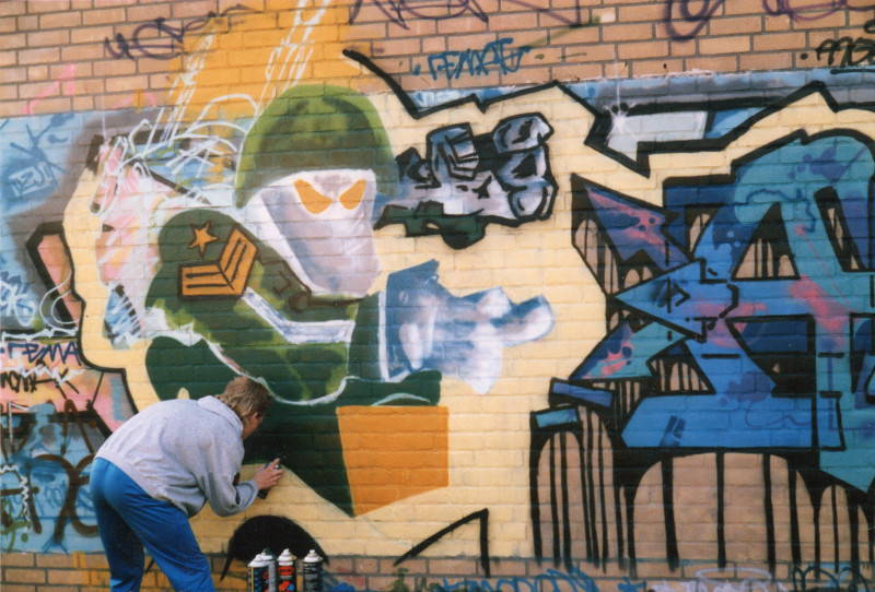 Min of meer, ja. Gekregen, gekocht, gejat. Ik zat in een andere stad op school. En daar ging ik een paar spuitbussen gestolen. Dat doe je. En toen ben ik daar ergens overdag op een muur in bij een bejaardentehuis iets gaan maken. Ik weet niet eens meer wat het was. Het moet echt heel kut geweest zijn. En toen werd ik direct zo bij m’n kladden gepakt. En toen zat ik op het politiebureau. Dat was het begin van een heel lang verhaal.