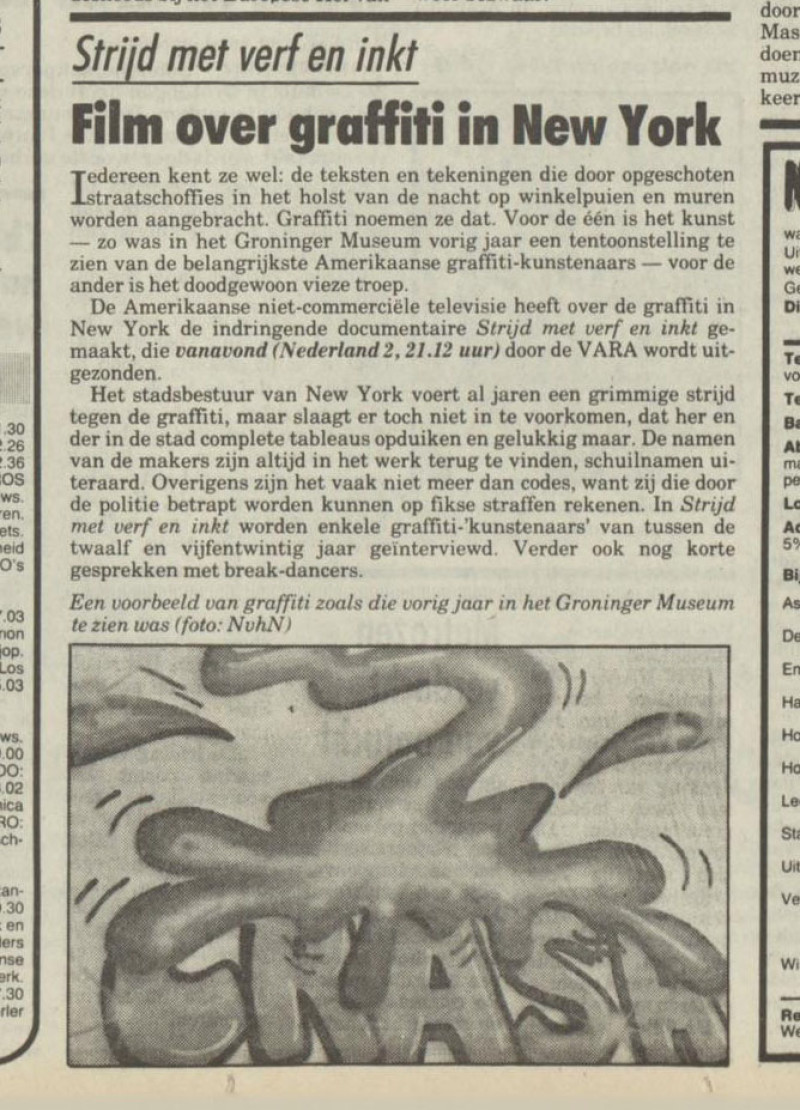 Er zit een intensiteit in die documentaire. Ik weet niet hoe dat hier in Groningen was, maar ik kom uit Winschoten, waar het echt een klein... waar het echt helemaal niks was. En waar ik al misschien een beetje geïnteresseerd was in de hiphop, maar waar ook een beetje neergekeken werd op alles wat anders was. En ik voelde wel dat er meer was dan alleen maar Winschoten. En... toen kwam dat ineens tevoorschijn. En dan identificeer je jezelf daarmee, denk ik. Of je denkt van, holy shit! Dit is iets. En ik weet niet, het had met elk ander ding ook kunnen gebeuren. Het had ook een ander soort muziek kunnen zijn. Of een ander soort kunst of weet ik veel. Bij iedereen kan het anders uitpakken. Maar bij mij sloeg het op dat moment in als een bom. Vijf dagen later werd ik opgepakt. Omdat ik mijn eerste graffiti piece had gezet.