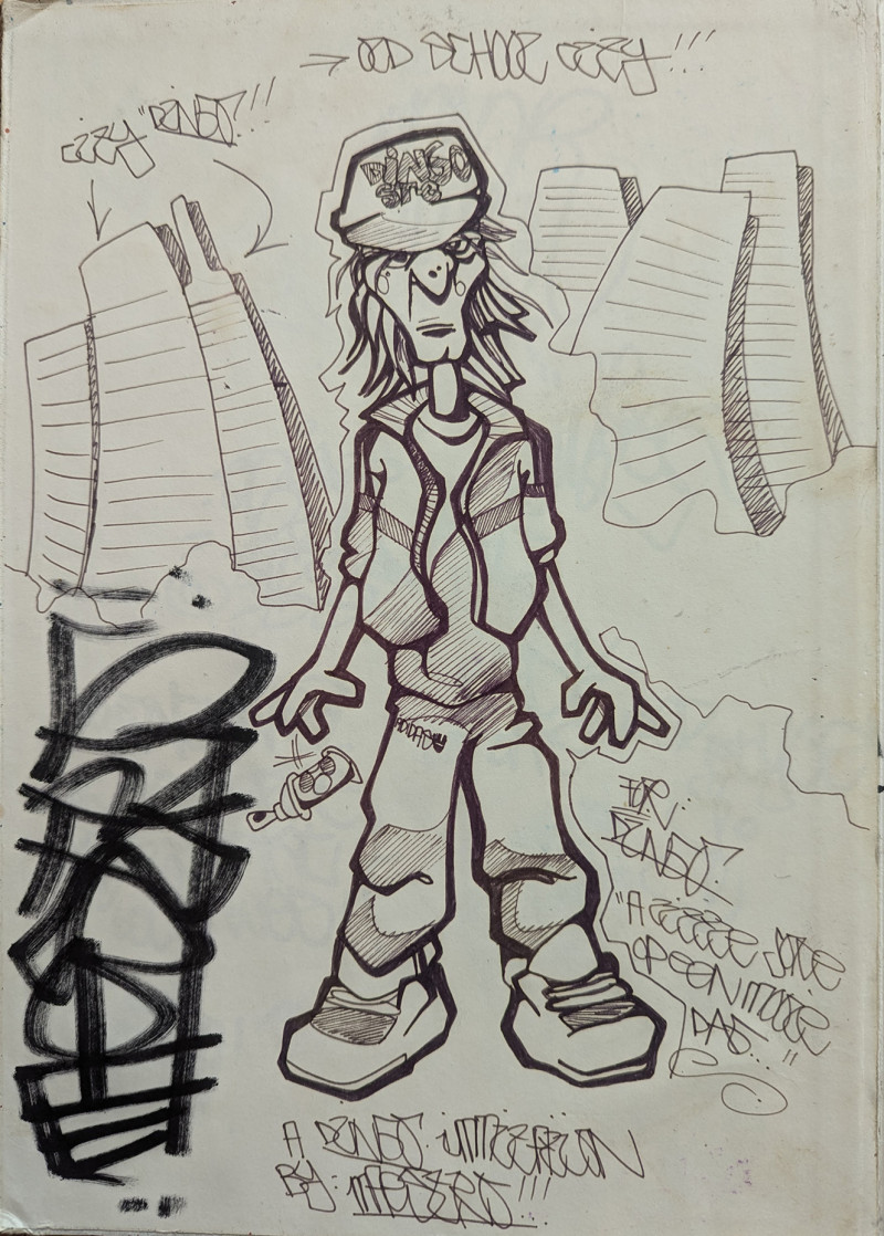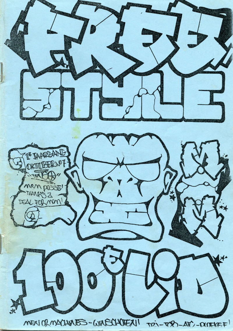 We gingen een keer naar Zwolle want daar zou een jam zijn, maar dat bleek niet het geval. Er waren daar ook andere gasten op afgekomen. En via hen zijn we achter het bestaan van Freestyle Magazine gekomen. Via dit blaadje kwam je in contact met andere schrijvers in Nederland. Bijvoorbeeld Maestro uit Haaksbergen, daar heb ik ook een briefwisseling mee gehad, en we ruilden schetsen. Hij heeft ook nog een schets voor mij gemaakt. Een soort van karikatuur in mijn blackbook. Nu begrijp je niet meer hoe het is om geen internet te hebben, maar Freestyle was toen echt fantastisch om contacten te maken. Ik was een van de eersten in Winschoten die lid was en weet die spanning nog van “wanneer komt 'ie nu”. Voor de brievenbus zitten wachten. En dan had dat geluksmoment dat hij er was, erdoorheen bladeren. Je stuurde werk op en dan kwam dat erin, dat was echt kicken, een geluksgevoel. Dan was je supertrots en liet je dat iedereen zien. Voor ons was het ook een opportunity bekender te worden, wij vonden het fantastisch dat onze schetsen in een blaadje terechtkwamen. Na Freestyle kwam Bomber Megazine, en ook al veel magazines uit Duitsland. De blaadjes werden full colour en de Freestyle werd minder belangrijk. De Bomber werd een serieuze referentie, het standaard blaadje. Want er stonden ook full colour foto's in.