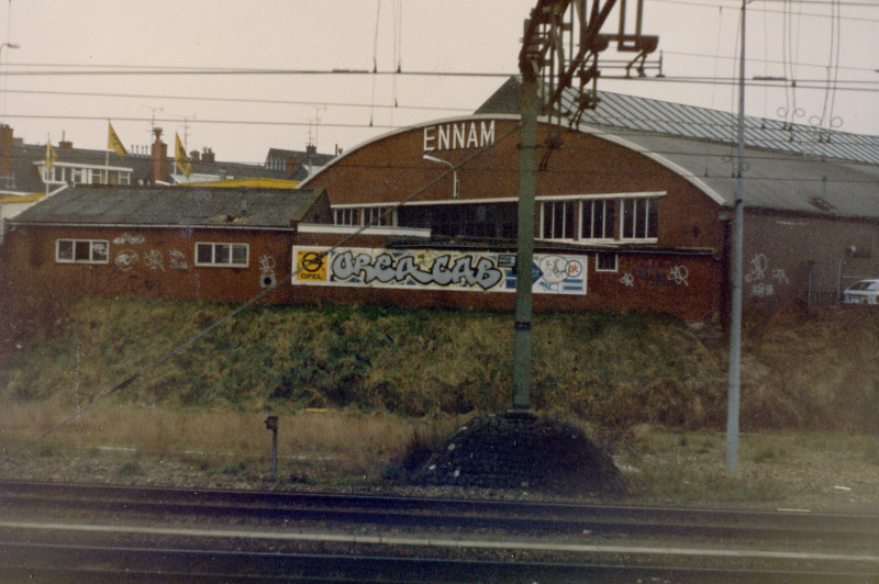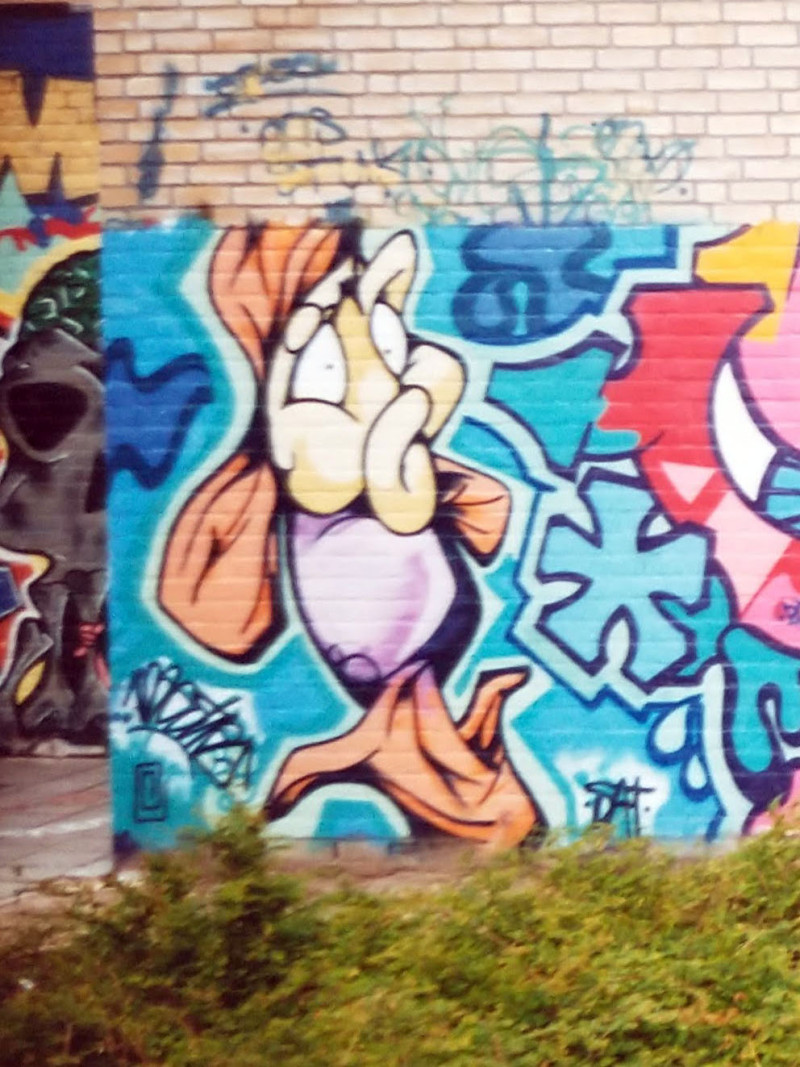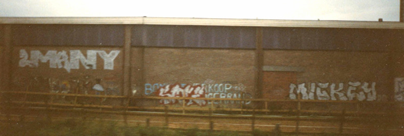 Ik weet nog, ik was bij mijn opa en oma, die woonden in het midden van het land, gingen we daar van Winschoten naar toe met de trein, dan had je bij Utrecht 3 of 4 pieces naast het spoor. Dat was het hè. En wat tags. Verder had je in Groningen een paar pieces, een paar bij Assen en een paar bij Zwolle. Dat was je info, daar moest je het mee doen. Af en toe ging ik in Groningen een fiets huren bij het station. Dan fiets je door de stad, en je gaat wat tags volgen, ja en als je geluk hebt kom je een piece tegen, maar als je pech had, dan niet, dan had je een halve dag rondgefietst en niets gezien. En af en toe kom je dan mensen tegen, zoals bij de sporthal. Daar kwamen twee jongens uit Amsterdam aanlopen. Van Amsterdam helemaal naar fucking Winschoten, om die sporthal te zien.