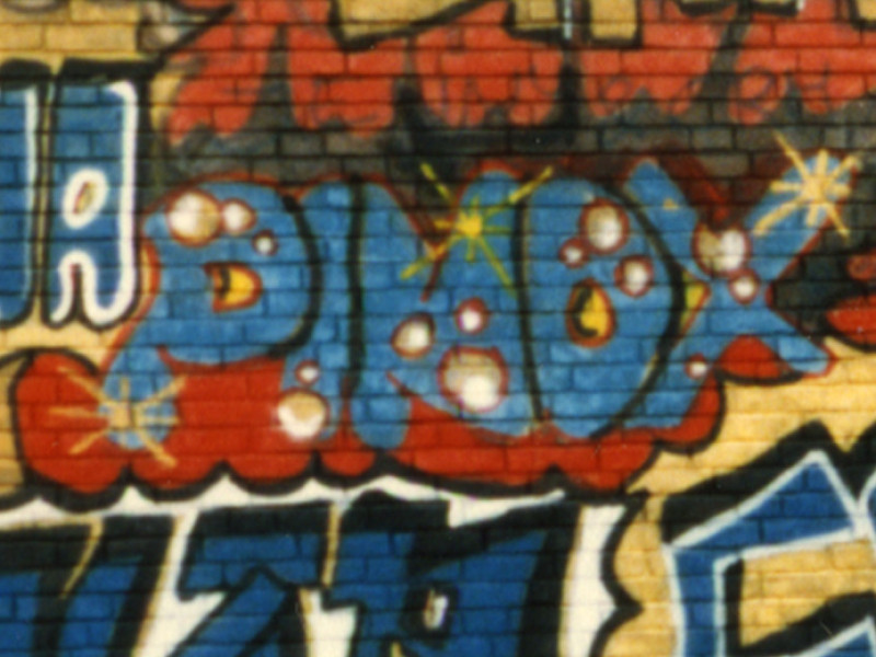 Pinox had ook eentje… die had ik ooit uit een auto gezien of zo, toen had ik wel Style Wars gezien - en hij ook denk ik, en die piece had dan een bolle… een soort 3D-effectje zeg maar, tenminste zo leek het uit de auto … en als je die nu terug zou zien dan is het waarschijnlijk onwijs knullig, maar toen dacht je ‘Hè hoe kán dat?!’. Ik ben er denk ik drie keer voorbijgekomen met de auto, maar ik heb het ook nooit meer teruggezien op een foto of zo. Of het ziet er op de foto heel anders uit dan in mijn herinnering”.